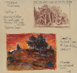 The summer brought "Unruly Nature: The Landscapes of Theodore Rousseau"--drawings and paintings of the great 19th c. French landscape artist. I found his work so inspiring--I made several visits and lots of little studies. I learned a new and very useful word: "ebauche"--a word used by critics to mean unfinished--but precisely the quality that makes his work feel very fresh, even raw at times. Here are some little thumbnails studies in pencil, ink wash and markers...